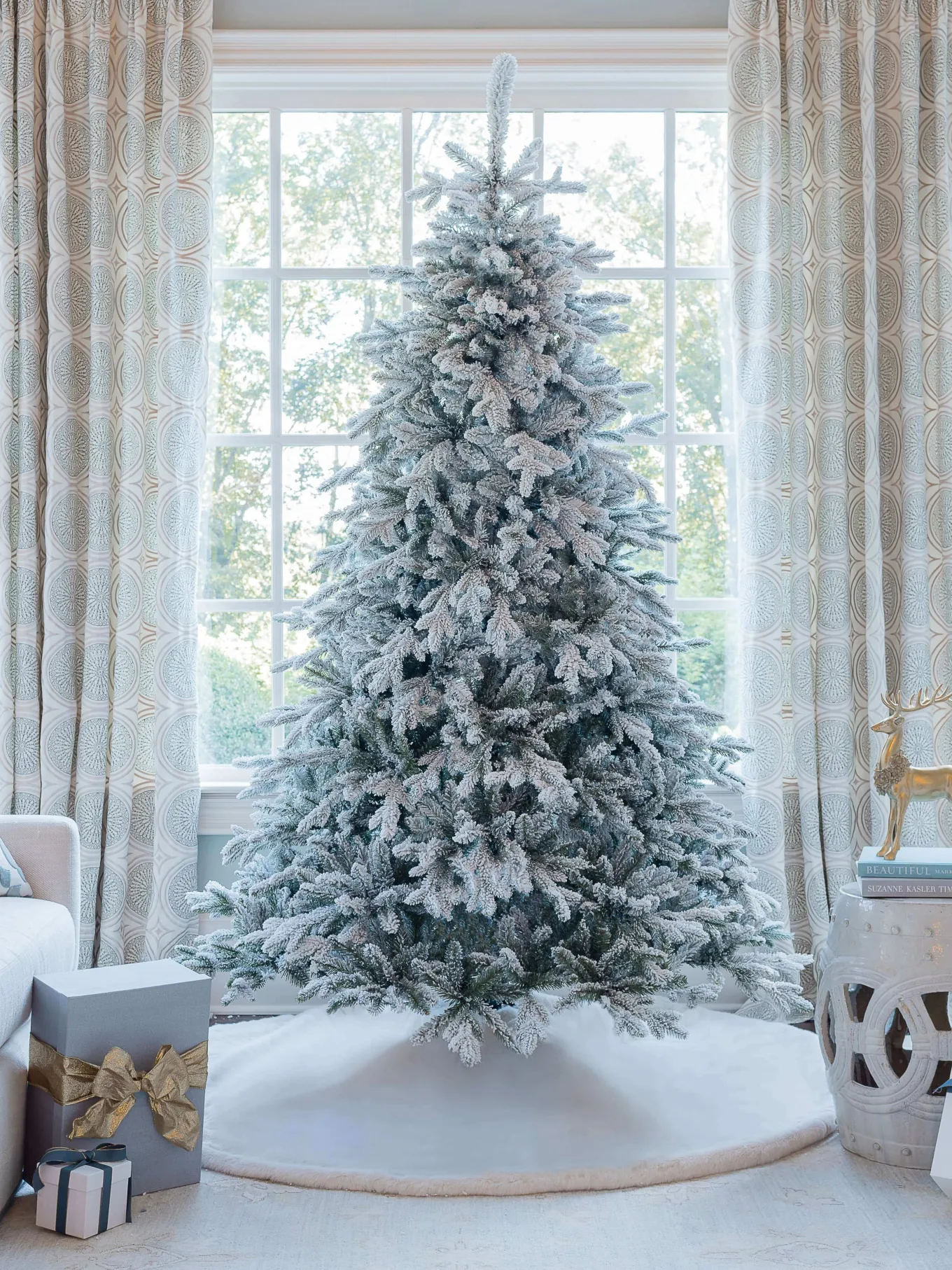 Create a magical holiday backdrop with the stunning Queen Flock. Envision a serene winter wonderland brought to life within the cozy confines of your living room. The Queen Flock is an ideal choice for those who cherish tradition with a hint of authentic elegance, featuring a lifelike flocked appearance that brings the enchanted look of fresh snowfall indoors. Each tree is carefully handcrafted, designed to mirror the majestic Alpine Fir native to the lush forests of Washington State. The Queen Flock – where memories are made and stories unfold under the gentle glimmer of holiday lights.