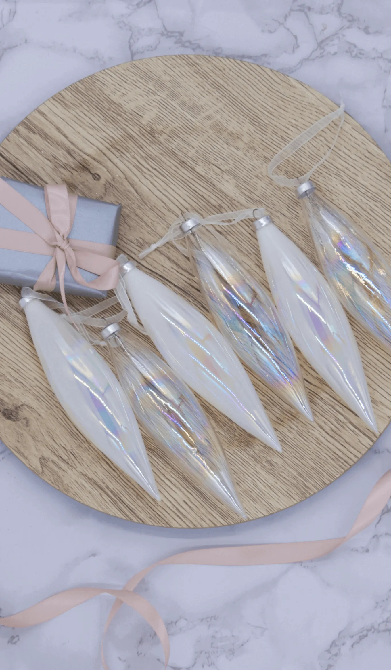with these six teardrop-shaped glass ornaments